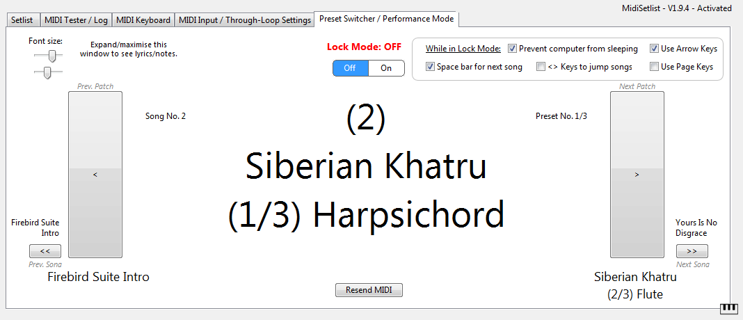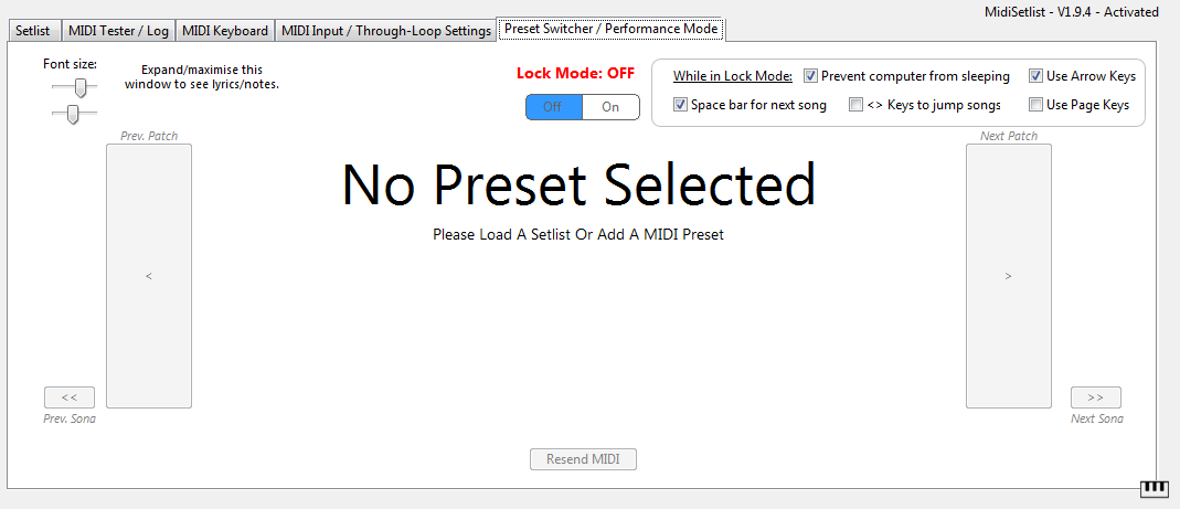 Preset Switcher / Performance Mode – a page containing all the selected song info (in big font) for when you come to perform. This also displays the next and previous preset / song info and controls to switch between them. Lock mode will lock the interface and allow you to operate the software using keystrokes.