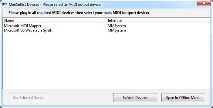 It is recommended that you have plugged in all the MIDI devices you will be using for your session first (in and outs), before opening the software. This will make sure that the application will recognise all the devices you will be using. However it is possible to rescan all the devices in the first window (output select window) using “Refresh Devices” (rescanning devices in the main MidiSetlist window is not possible, you will have to close it and rescan).