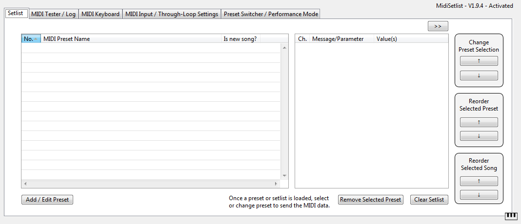 In a nutshell, MidiSetlist is a program that will send up to 128 MIDI messages at the same time with one click. These are contained with-in one “preset” that can be ordered within a setlist. Each preset can send 16 SysEx messages and also 5 Control Changes messages and 2 Program Change messages for each of the 16 MIDI Channels. Presets can be grouped into songs. This makes programming external MIDI devices for a performance easy!