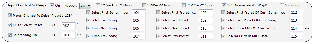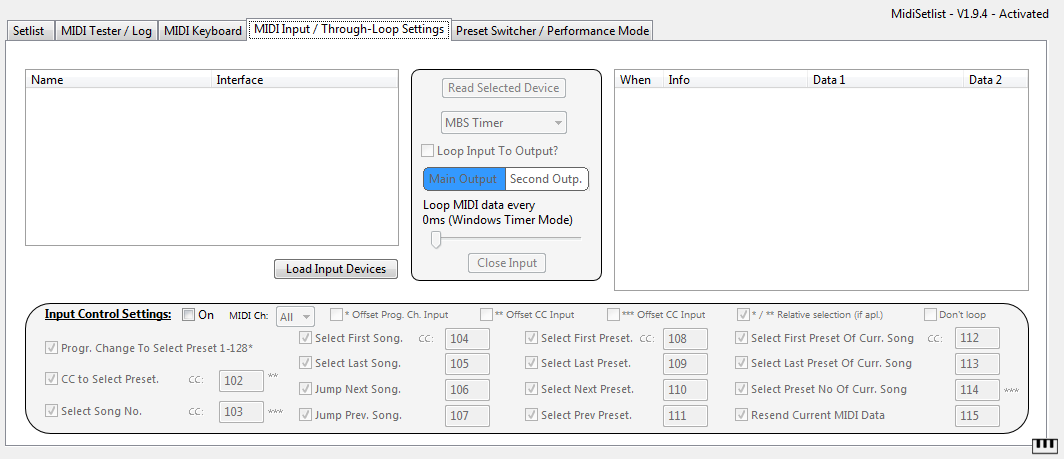 Input Control and Loop-through – MidiSetlist will let you control many functions like “Next preset” “Next Song” “Select preset Number Of Current Song” and many more using incoming control change messages, and will let you select preset numbers using program change messages. Additionally, you can loop-though the input to one or both outputs while using the software, meaning you can connect a controller keyboard into the input, and output it to an external midi device that you are also controlling with MidiSetlist. This could also be used to control other internal MIDI software if used in conjunction with programs such as “loopMIDI”.