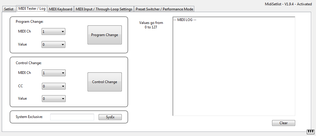 Easily Accessible MIDI Tester – Test Program Changes, Control Changes, System Exclusive messages to your MIDI output device(s), and also Note On / Off messages with the MIDI keyboard. No need to scroll through multiple menus to find them.