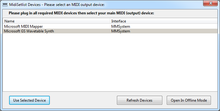 It is recommended that you have plugged in all the MIDI devices you will be using for your session first (in and outs), before opening the software. This will make sure that the application will recognise all the devices you will be using. However it is possible to rescan all the devices in the first window (output select window) using “Refresh Devices” (rescanning devices in the main MidiSetlist window is not possible, you will have to close it and rescan).