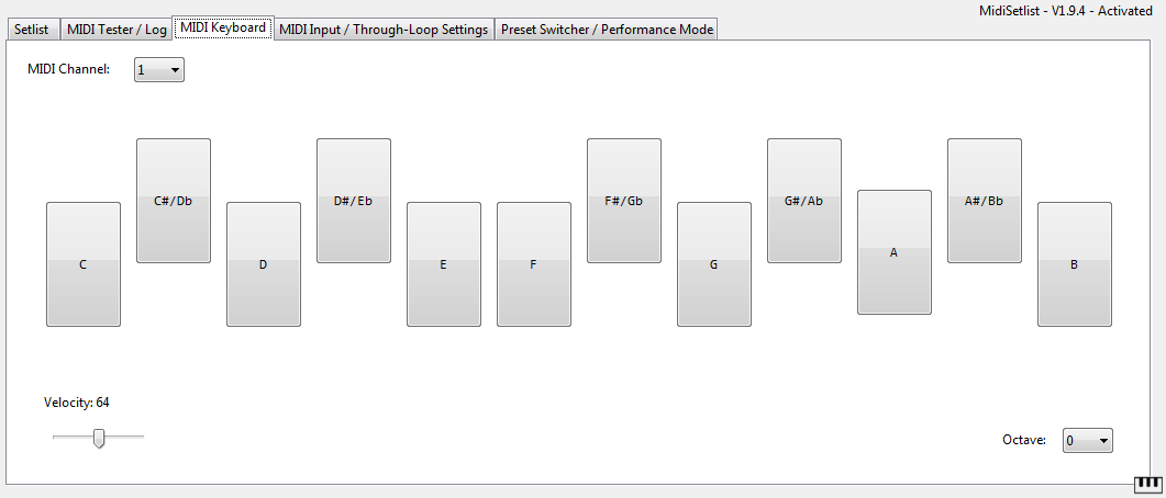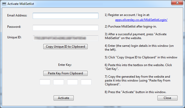 Once activated the MidiSetlist will remember you will only have to do this once. Licence keys are linked to login details from registration form on the website and will be unique to each computer. However, MidiSetlist doesn't not need an internet connection to activate it – you can keep the computer you are running MidiSetlist on offline if you need to, as long as you have a separate device you can create an account / purchase / get the activation key. The activation status is shown in the top right of the main window.