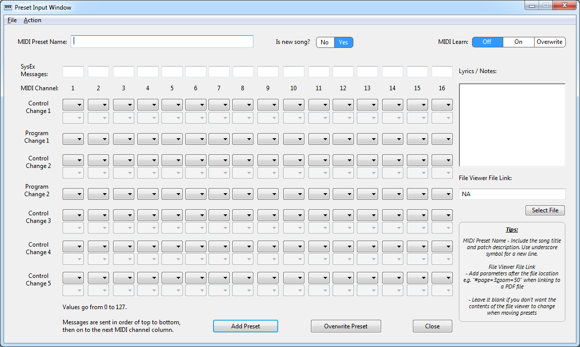 You can let MidiSetlist detect incoming midi messages from your input device to be replicated into a preset. First set your MIDI input device using the file menu on the main window, then set the Midi Learn segment in the top right corner of the Preset Input window to “On” or “Overwrite”. “On” will populate the dropdowns menus with any incoming MIDI messages assuming they are not already filled in. Overwrite will always fill in the dropdown menus from the top down.